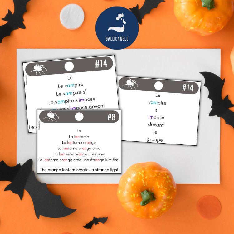 Halloween themed French reading fluency passages practice cards to improve your students' decoding and pronunciation skills. You will find a general progressive approach, using two basic reading methods : the Vertical and Expansive methods. Meant to be used as a literacy center. Ideal for beginners and independent study for active learners.