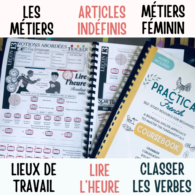 Beginner French lessons about determiners (definite and indefinite), jobs (masculine/feminine form), how to talk about one's job (including workplaces), how to read time and how to conjugate the verbs from the 1rst, 2nd and 3rd group in the present tense. Ideal for self-learners or small classroom settings.