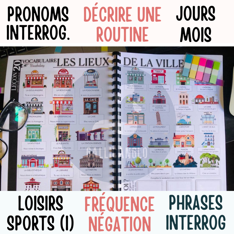 Beginner French lessons about : talking about one's routine (times, days, months, frequency) and how to build questions and negative sentences. Discover the different places one can find in a city as an introduction of navigating a city.
